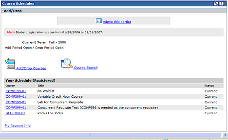 When the user is logged in as a Student and the Course Schedules portlet is accessed from a context where the Student role is required, the user gets a default screen that shows different fields including the courses in which the student is already confirmed enrolled.  Course Details for each course display when a course link is clicked.  Click My Account Info at the bottom of the screen to display account balances and the course and fee statement.